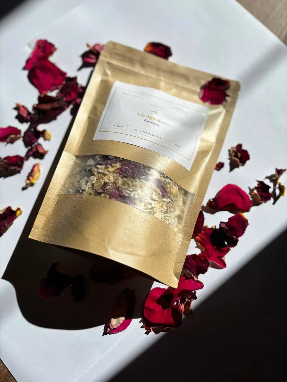 Nyisd ki a tasakot, hajolj közel, és hagyd, hogy az illatok egy pillanatra megállítsák az időt. Ezzel a nyugalom első lépését teszed meg. Ha már átjárt a finom illat öntsd a fürdőteát a csomaghoz tartozó zsákba – ez lesz a saját kis fürdőrituáléd alapja.